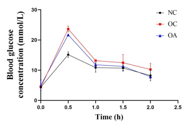 As shown in fig. 3, the blood glucose concentration of the rats in the OC group was significantly higher than that in the NC group at each period (p<0.05). Meanwhile, the blood glucose concentration of the rats in the OA group was lower than that of the OC group, and the blood glucose level at 1.5-2.0 h was almost the same as that of the NC group. The results indicated that the regulation of blood glucose of the OC rats was poor, while that of the OA rats was improved after RhA intervention.