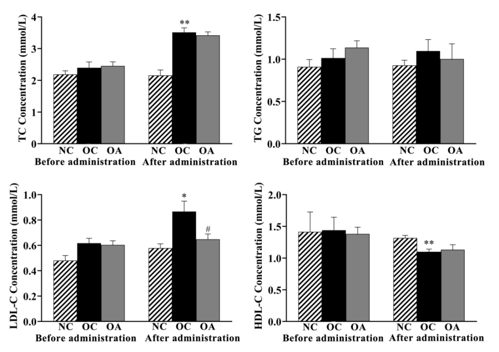 Fig. 4: Blood lipid levels in rats (NC: normal control group; OC: obese rat model control group; OA: obese rat model administration group; n=7, mean±SD)
