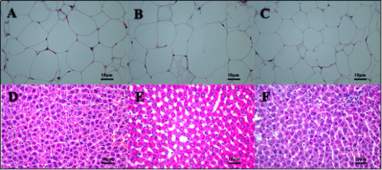 Fig. 5: H and E staining of adipose and liver tissues. A: Adipocytes of NC group; B: Adipocytes of OC group; C: Adipocytes of OA group; D: liver of NC group; E: liver OC group; F: liver of OA group (NC: normal control group; OC: obese rat model control group; OA: obese rat model administration group)