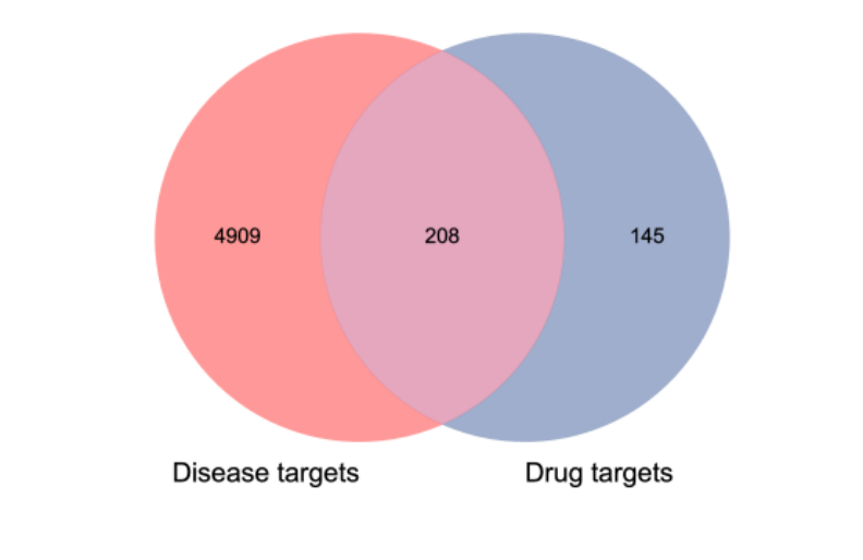 As shown in fig. 7, a total of 9,496 obesity-related disease targets were retrieved, and 5,117 targets with a correlation score above the median were screened out, intersecting with the predicted 353 potential targets of the main compound of RhA. Finally, 208 common targets were obtained. The common targets were visualized and a PPI network diagram was constructed (fig. 8) which includes 205 nodes and 2379 edges. The round nodes represent the top 20 core targets. The edges connecting the nodes represent the interaction between common targets for the treatment of obesity by RhA and each target protein corresponds to many other target proteins, indicating that the target proteins are interrelated and cooperated to participate in the biological process in vivo.