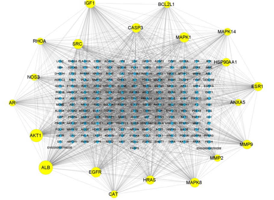 Cytoscape is a network biology visualization and analysis application that visualizes molecular connections and biological processes [20-22]. In order to visualize and simplify the complex relationship between the main active compounds of RhA, potential targets and obesity, the network file of the relationship between the screened target and the compound was imported into Cytoscape 3.8.1 software, and their relationship was abstractly represented as a "component-target" network, with nodes representing the corresponding components or targets, and edges representing the relationship between nodes.