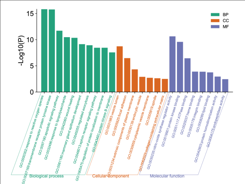 As shown in fig. 9, GO enrichment analysis showed that the BP mainly includes the response to reactive oxygen species, receptor tyrosine kinase, apoptosis signaling pathway, response to lipopolysaccharide, wound healing, mammary gland development and epithelial differentiation, regulation of exocytosis, ephrin receptor signaling, regulation of protein localization to membranes, protein kinase B signaling. CC mainly include vesicle lumens, focal adhesions, extrinsic components of plasma membranes, endocytic vesicles, cytoplasmic vesicle membranes, spindles, and collagen-containing extracellular matrix. MF mainly includes nitric oxide synthase modulator activity, protein kinase binding, ATPase binding, heme binding, integrin binding, lipid binding, protein homodimerization activity, endopeptidase activity.