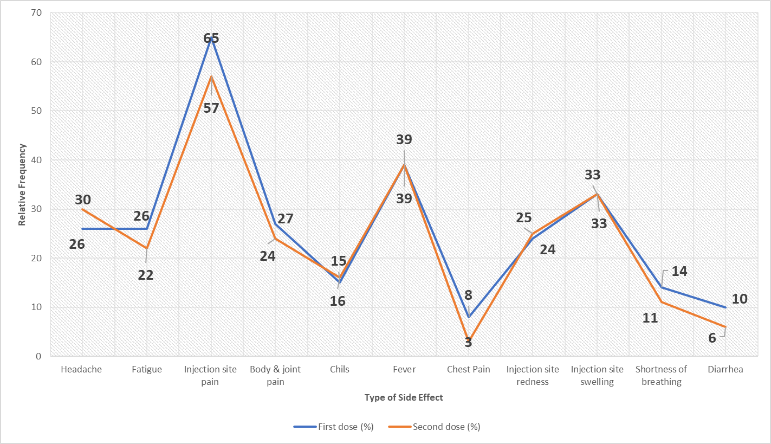 Fig. 1 presents the distribution of side effects at different dose levels for COVID-19 vaccination. The fig.. Compares the percentage of individuals experiencing various types of side effects after receiving the first and second doses. Among the reported side effects, headache was observed in 26% of individuals after the first dose, slightly increasing to 30% after the second dose. Fatigue was reported by 26% after the first dose but decreased to 22% after the second dose. Injection site pain was the most reported side effect, experienced by 65% of individuals after the first dose and 57% after the second dose. Furthermore, in a previous study, it was discovered that the majority of healthcare workers (HCWs) rightly recognized side effects such as pain (96.15%), fever (65.48%), allergic reactions (48.04%), and paralysis (8.15%); even at this point, HCWs agreed that vaccine is required to effectively combat this deadly pandemic [24]. Other side effects, such as body and joint pain, chills, fever, chest pain, injection site redness, injection site swelling, shortness of breath, and diarrhea, showed variations between the two doses.