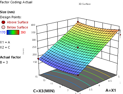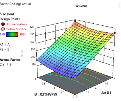 The results showed that all of the produced formulations have particle sizes ranging from 170.06 nm to 390.01 nm. The particle size of all the formulations is given in table 03. It is abundantly clear that the drug lipid ratio (X1) directly affects particle size, whilst an increase in surfactant concentration (X2) first caused a significant decrease in particle size, followed by a minor increase with additional increases in surfactant concentration. Initial surfactant concentration increases were intended to lower interfacial tension, generate steric hindrance on the surface of the SLN, limit the accumulation of individual particles, and improve stability.[55] There was very little impact of ultrasonication time (X3) on particle size. More thorough information on the impact of numerous independent parameters on particle size is provided by a 3D response surface plot in fig. 2A.