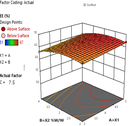 Statistical examination and by determining the effect of independent factors on responses, the optimized formulation parameters were selected by software. BBD recommended the most suitable numeric values for the preparation of optimized formulation as 3.90 Drug: Solid lipid ratio, 2.642% surfactant concentration, and 7.58 min ultrasonication time. The optimized formulation was then subjected to further studies [55].