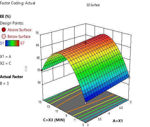 A non-linear polynomial equation derived from the BBD, was employed to model the relationship between the independent variables and the response (Y). The equation (Y = b0+b1X1+b2X2+b3X3+b12X1X2+b13X1X3+b23X2X3+b11X12+b22X22+b33X32) consisted of an intercept term (b0), linear coefficients (b1, b2, b3), interaction coefficients (b12, b13, b23), and quadratic coefficients (b11, b22, b33). These coefficients were determined based on the observed experimental values of the responses obtained from the experimental runs. The independent variables X1, X2, and X3 represented the coded values of the solid lipid, surfactant concentration, and sonication time, respectively [18, 19].