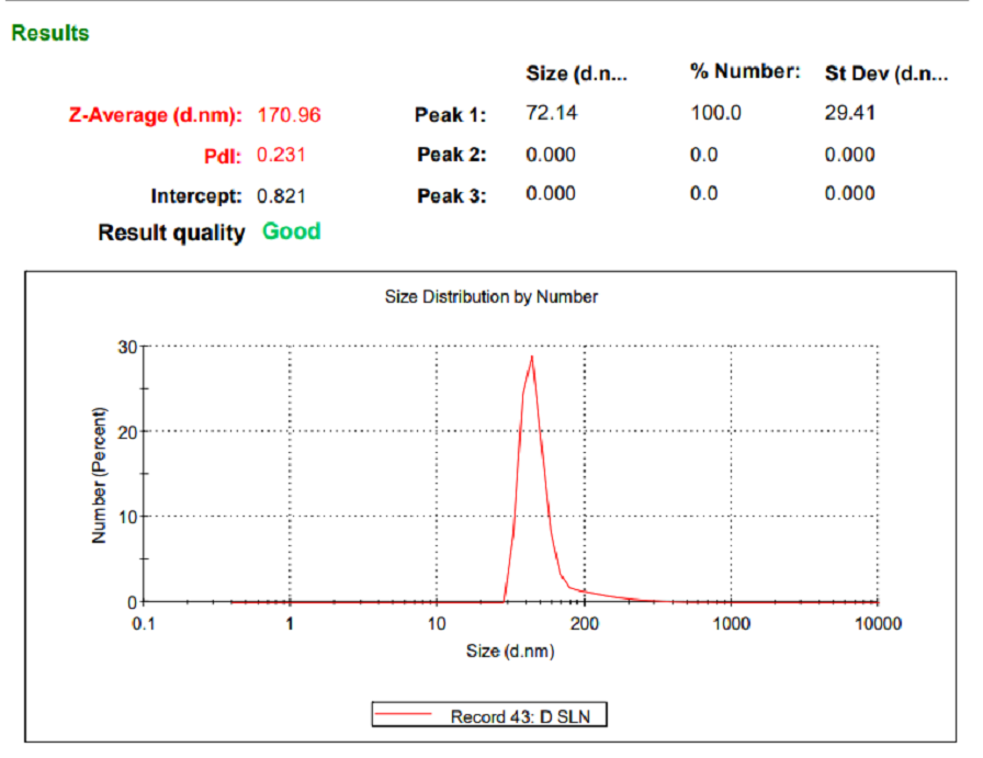 The particle size of the optimized diosgenin-loaded SLN was found to be 170.96 nm. This indicates the successful formation of nanosized particles, which is beneficial for drug delivery applications. Nanoparticles in this size range have been shown to improve drug delivery efficiency, increase cellular uptake, and enhance bioavailability due to their small size and increased surface area. The low PDI value of 0.231 further confirms the homogenous distribution of particles within the formulation. A low PDI indicates minimal aggregation and narrow size distribution, which is crucial for the stability and reproducibility of the SLN [56, 57]. The particle size graph of the optimized formulation is given in fig. 3.