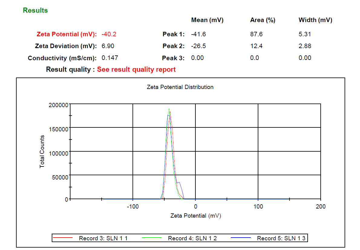 The electrophoretic mobility of the SLN dispersion was evaluated with the help of the Malvern Zetasizer, and the zeta potential of the dispersion was computed [37, 38]. The measurements of each sample were performed three times [39, 40].
