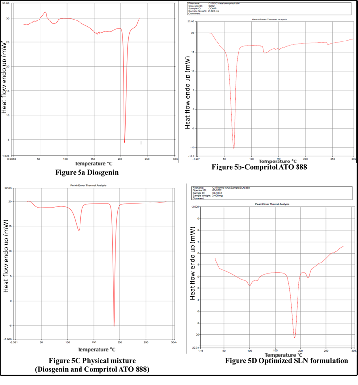 The thermogram of diosgenin pure and compritol ATO 888 pure showed a sharp peak at 210 °C (fig. 5a) and 72 °C (fig. 5b), respectively. A physical mixture of diosgenin and compritol ATO 888 showed a sharp peak at approximately 190 °C (fig. 5C) due to the exchange of heat, but a sharp peak indicates no chemical changes. DSC of optimized formulation showing broadband (fig. 5D) due to the interaction of drug and other formulation ingredients. These interactions may contribute to the enhanced solubility and controlled release of diosgenin from the SLN, making it a potential strategy to improve the drug's bioavailability [61-63].