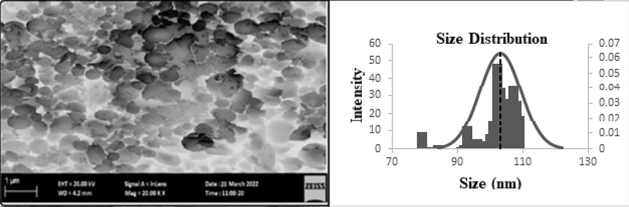 Fig. 6: SEM image and particle size distribution curve of optimized formulation
