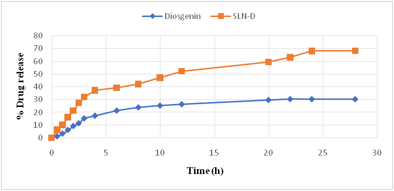 In vitro drug release from the SLN was studied by dialysis bag technique initially 2 h in 0.1N HCl and further up to 28 h in phosphate buffer pH 6.8. The findings demonstrated that diosgenin is hydrophobic, it shows a maximum of 30.17% of drug release in the whole span of the release profile but the formulation has characteristic release and solubility. Drug release of optimized formulation was 68.27% in 28 h. The sustained release is beneficial for maintaining therapeutic drug concentrations, reducing dosing frequency, and potentially improving patient compliance [64, 65]. The In vitro drug release of diosgenin pure and optimized formulation is illustrated in fig. 7.