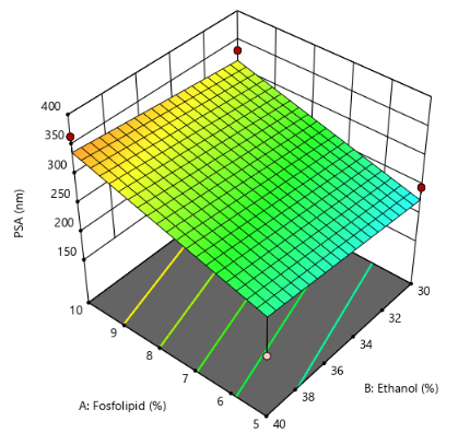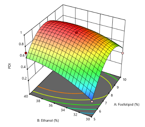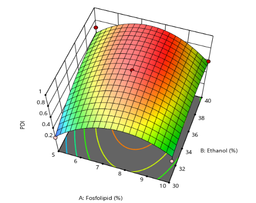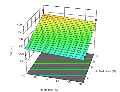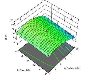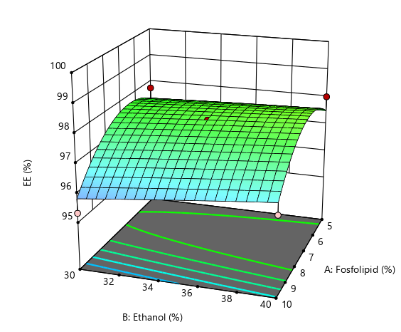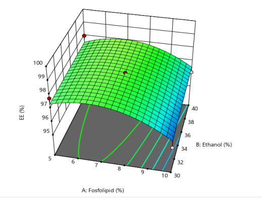 Based on equation 4, it shows that the entrapment efficiency through the Box Behnken Design approach shows that with the addition of soya lecithin give a significant effect on the entrapment efficiency. 7,5%, surfaktan 3%, ethanol 30%.