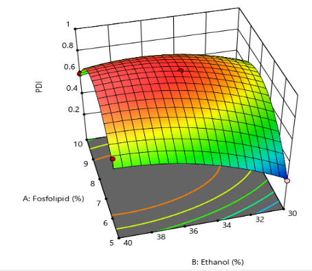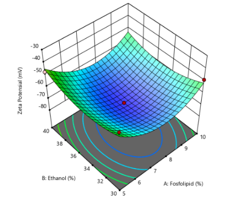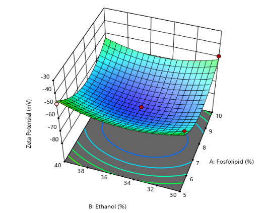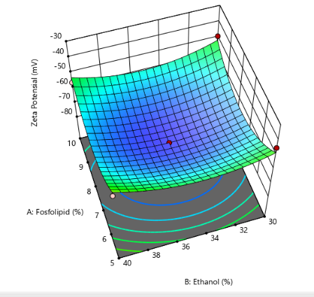 Based on the above equation 3. shows that the zeta potential is influenced by ethanol, which show negative interactions by giving a significant effect on the zeta potential. Likewise with the addition of surfactants and ethanol provide a significant effect on zeta potential.