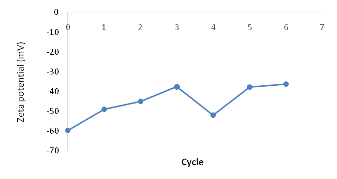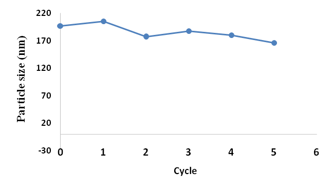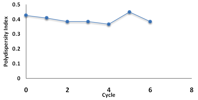 Based on stability test data after 6 cycles. The particle size shows that the particle size is still within 220 nm (100-400 nm), this data shows that the particles are still within the required value range. The particle size uniformity index in 6 cycles is still below the value of 0.5, this value shows the value that is still required and likewise, the zeta potential value shows a value below-30 mV, this shows particle stability with a high value of repulsion between particles so that the possibility of aggregation is small [10-13].