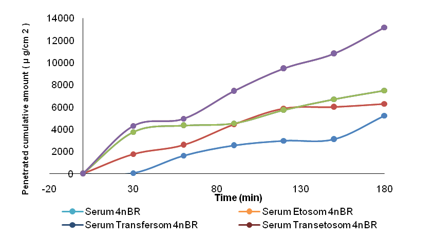 Fig. 9: The result of the cumulative amount of the active substance 4nBR penetrated from various forms of vesicles in the serum