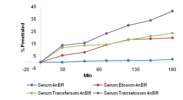 Penetration test of serum preparations was carried out using a 0.45 μ PTFE filter with Franz diffusion cell (diffusion area 1.77 cm2, compartment volume 13 ml, receptor compartment filled with phosphate buffer pH 7.4 and temperature 37±0.5 ᵒC). Serum transetosomes 4nBR and serum without transetosomes 4nBR were weighed as much as 1 gram each and applied to the membrane. A total of 0.5 ml of sample was taken from the receptor compartment periodically for 8 h using a syringe and replaced with an equal amount of phosphate buffer pH 7.4. The samples obtained were measured for their absorption with an UV spectrophotometer at a wavelength of 249 nm [27].