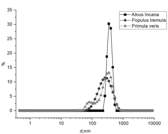 Fig. 1: Results obtained by the DLS method, showing the volume distribution of fractions of the dispersed phase