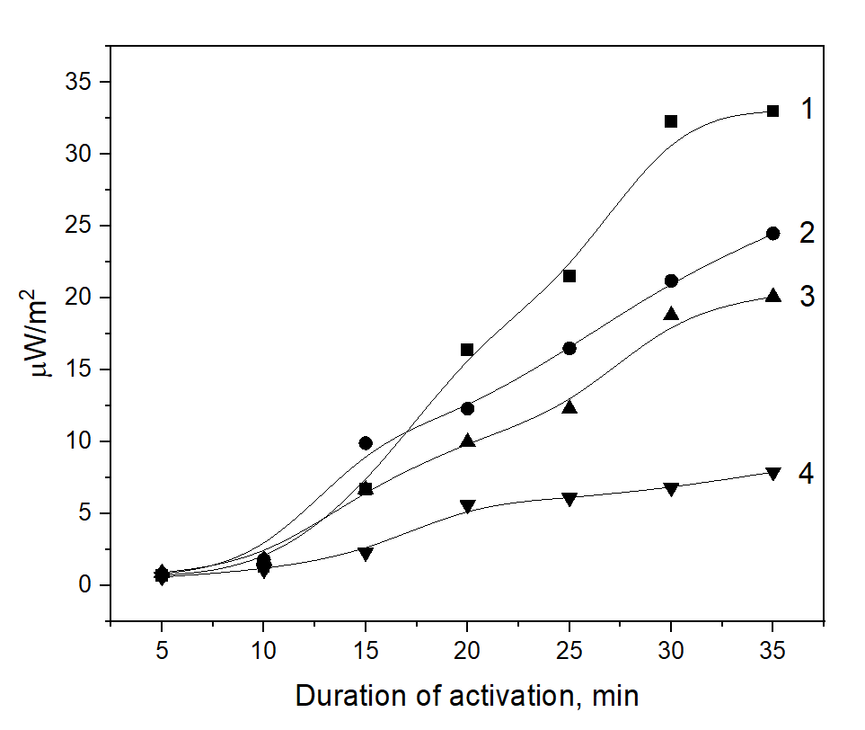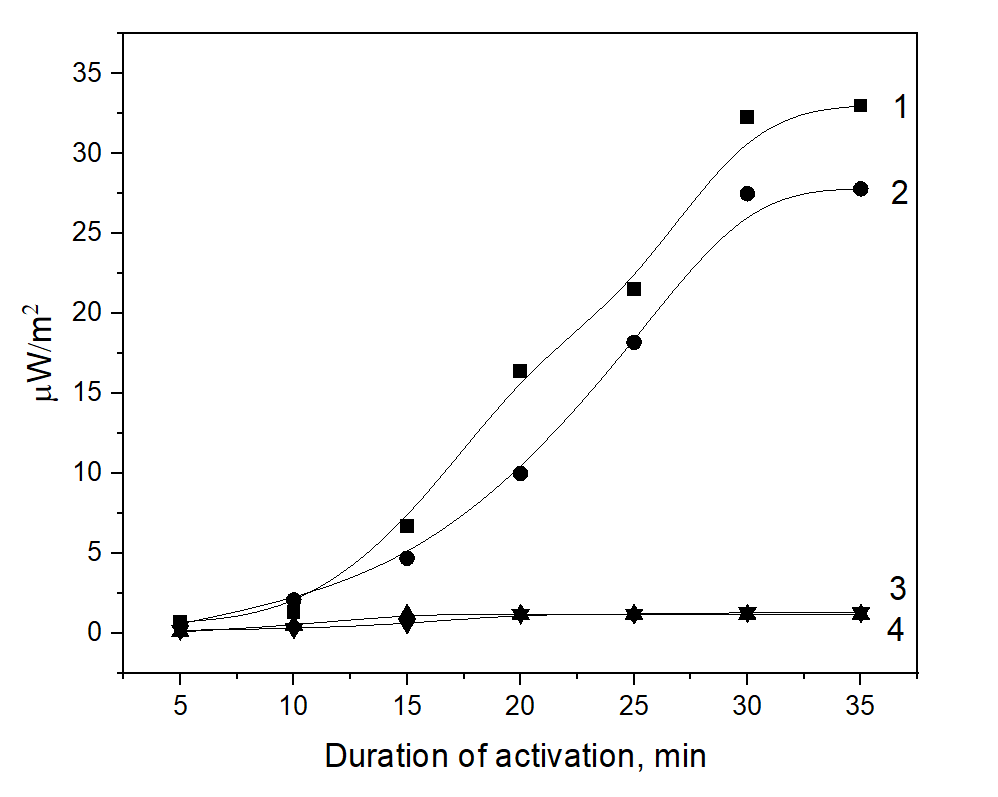Fig. 5: Comparison of thermal radio emission of HAs without dilutions and diluted HAs, where 1–undiluted HAs, 2–1:10 HAs, 3–1:100 HAs, 4–1:1000 Has