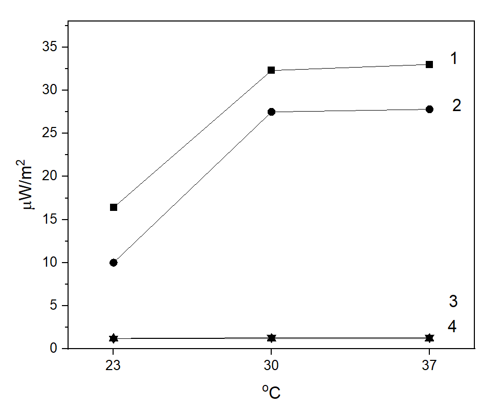 Fig. 4: Comparison of thermal radio emission of three samples of HCs from different manufacturers at three different temperatures, where 1–HAs produced by a biotechnology system, 2–HAs produced in georgia, 3–HAs by Faberlic, 4–HAs by biodoron