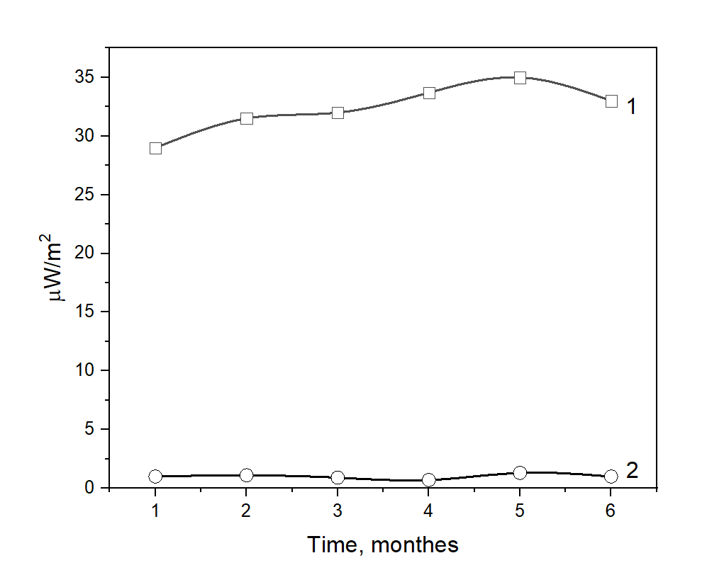 Fig. 3: Semi-annual time curve for reproducibility of results obtained when measuring the intrinsic thermal radio emission of samples, where 1–HAs produced by system biotechnology, 2–background values
