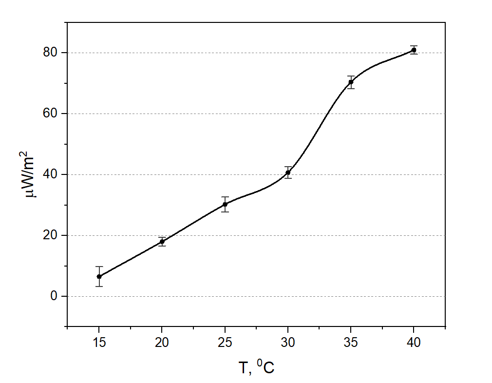During the temperature 'titration' of the preparation, the dependence of the thermal radio signal on temperature is observed. The temperature range from 30 °C to 35 °C is indicative in terms of sharp increase in the signal which occurs within this range (fig. 6). The curve shows an increase in the radio thermal signal with heating of the preparation to 40 °C.