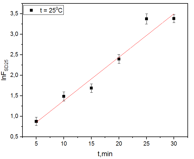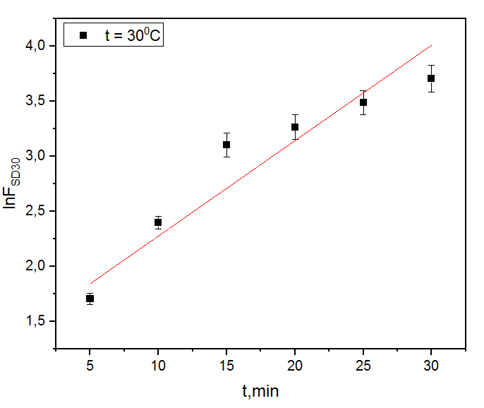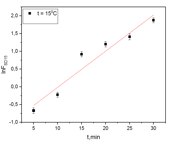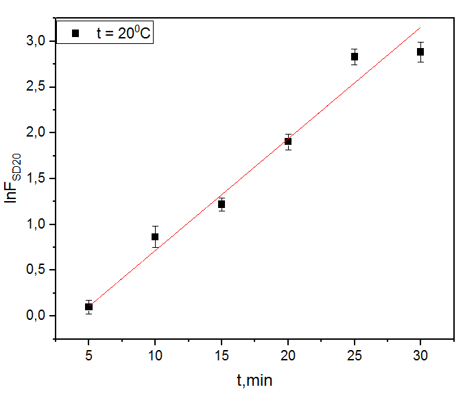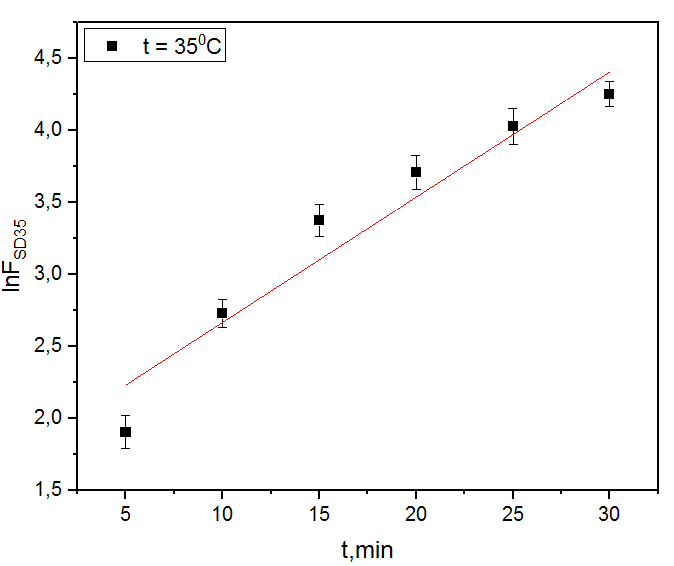 Fig. 7.1 shows graphs of the ratio, where F is the density of the radiothermal radiation of the HAs, and t is the time in min. The values of the reaction rate constant (k) for each of the temperature points of the experiment were obtained from these graphs. The reaction rate constant is the tangent of the alpha angle and was calculated by Origin Pro Lab 21 software as the slope value. Considering that this interpretation of the experiment is characterized by a first-order reaction and, knowing the Arrhenius equation, we derive from it a formula for Ea calculation (1.4).