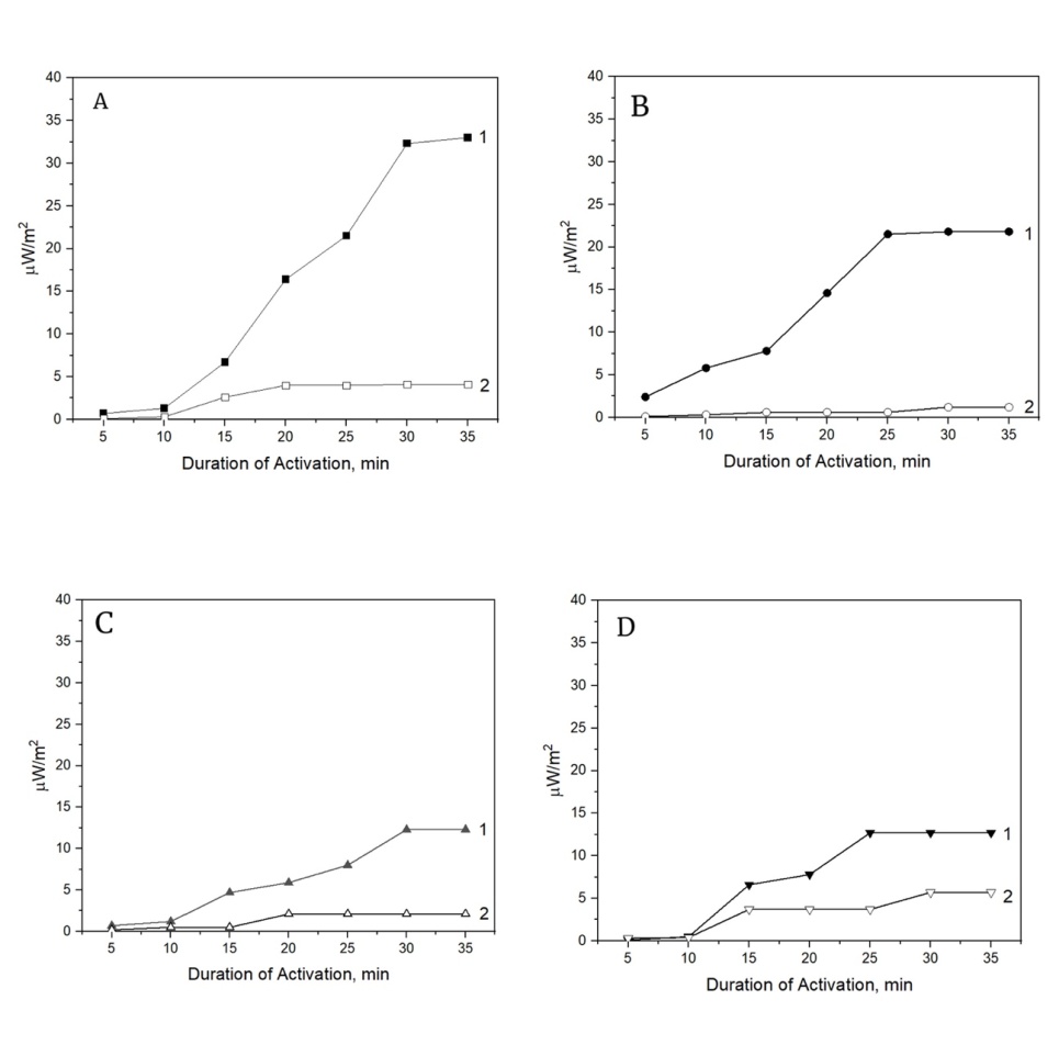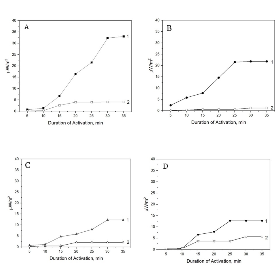 Fig. 8: Comparison of thermal radio emission of various preparations with HAs manufactured in 2022 (1) and 2020 (expired) (2), where A–HAs, B–Ortilia Secunda, C–Alnus Incana, D–Crude Turpentine