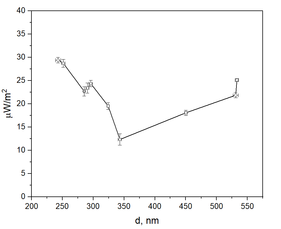We also verified the dependence of the intrinsic radiothermal emission of HAs preparations on their size spectrum. An important task for us was the ability to understand what factors can affect the radiothermal emission of supramolecular complexes. As we showed in fig. 9, there is a stable dependence of radiothermal emission on the size spectrum of nanoparticles that are part of the preparations of MP+HAs. An interesting fact is that the narrower the particle size spectrum (in nanometers), the greater radiothermal emission is observed. As we described above, the complex structure of nanoparticles, due to the formation of temporary dipoles on their surface, leads to the formation of plasma-like "clouds" on the particle surface. The plasmonic resonance formed allows for detecting radio thermal emission from Has preparations. Considering the fact that the size spectra of preparations, which varied from 245 to 325 nm show an emission 1.5 times higher than the emission of preparations, the size spectrum of which started from 345 nm, it can be assumed that due to the small particle size more frequent formation of plasma-like "clouds" takes place, which allows for the amplification of the radio thermal emission signal.