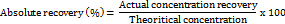 The recovery of the liquid-liquid extraction (n=6) was determined by comparing the amount of analyte extracted from the sample to the amount of analyte in the unextracted standard. The absolute recovery of the extraction method was calculated as described by the equation below: