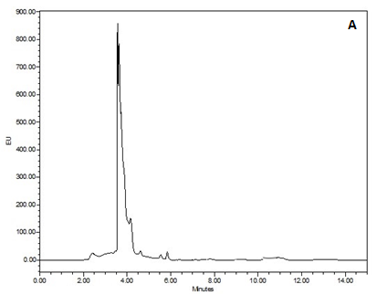 The absolute recovery of xanthorrhizol from rat plasma using a combination of acetonitrile and THF in a 7:3 ratio as a deproteinizing agent is shown in table 3. The study was performed at a three-level quality control concentration of xanthorrhizol: 5 µg/ml (high), 1.2 µg/ml (medium), and 0.156 µg/ml (low). The recovery ranged from 99.341-103.198%, which is considered adequate and acceptable. An internal standard was not employed because this method only required the direct injection of plasma samples after a short deproteinization process.