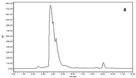 Fig. 2: Chromatogram of A) rat blank plasma, B) rat blank plasma spiked with 5 µg/ml of xanthorrhizol