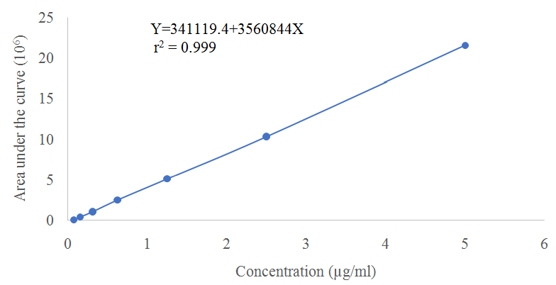 The linearity range in the quantification method establishes a direct correlation between test performance and drug content in a defined range in the biological sample [44]. A 7-point calibration curve was constructed for xanthorrhizol in rat plasma (fig. 3) using concentrations that were selected based on the probability of the drug level during pharmacokinetic studies. The calibration curve showed excellent linearity over the range of 0.078 to 5 µg/ml. A 1/x weighted method was used to fit the calibration curve to a linear equation, Y=341119.4+3560844X, with a regression coefficient (r2) of 0.999, indicating a good fit of the data to the linear model.