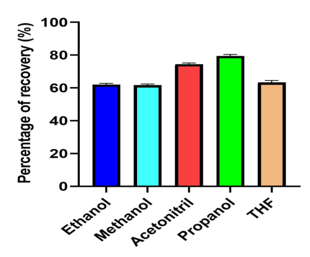 The liquid-liquid extraction method is more cost-effective than the solid-liquid extraction [46]. This method uses a deproteinization solution to precipitate proteins from the plasma sample, thereby releasing xanthorrhizol. The polarity of the deproteinized solution and the resulting mixture must be optimized to dissolve the release of xanthorrhizol. In this study, we investigated the optimization of the use of deproteinized agents such as methanol, ethanol, acetonitrile, propanol, and tetrahydrofuran (THF). Fig. 4 shows that acetonitrile and propanol have the highest percentage of recovery, 71.884%, and 78.060%, respectively. Meanwhile, ethanol, methanol, and THF have similar recovery rates in the range of 60.191-62.063%. Although acetonitrile is a better deproteinizing agent than propanol, it cannot completely extract xanthorrhizol from plasma samples. To improve the extraction efficiency of acetonitrile, it was combined with THF at different ratios. THF is a polar solvent that plays a crucial role in the solubility of lipophilic compounds [47].
