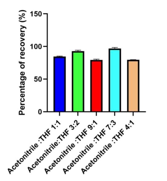 Fig. 5: The Absolute recovery of the combination of acetonitrile and THF. Results are expressed as mean ± SEM of 3 experiments (n=3).