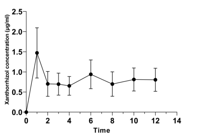 The bioanalytical method was applied to the pharmacokinetic study of xanthorrhizol in healthy male Sprague Dawley rats following oral administration. The results, depicted in Fig. 5, show the xanthorrhizol concentration in plasma over time.