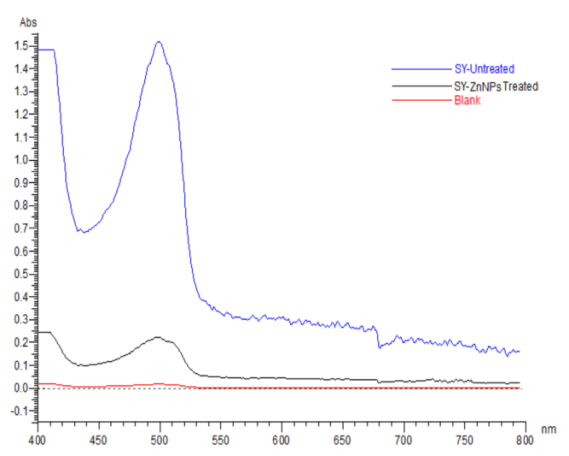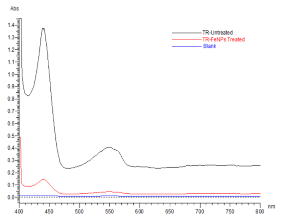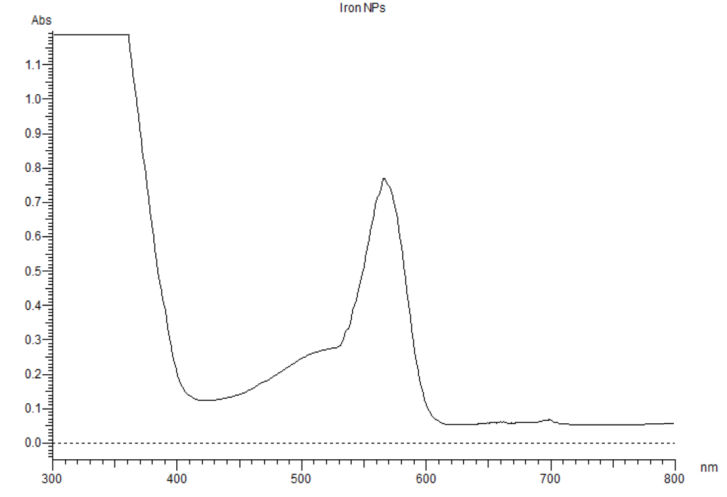 During the nanoparticle synthesis process, a striking transformation in the color of the leaf extract was observed due to the reaction with the metal solution. The observed color change was further quantified instrumentally using a spectrophotometer across the wavelength range of 800-300 nm, whereas the absorption spectra of the aqueous leaf extract was measured within the scan range of 800-200 nm.