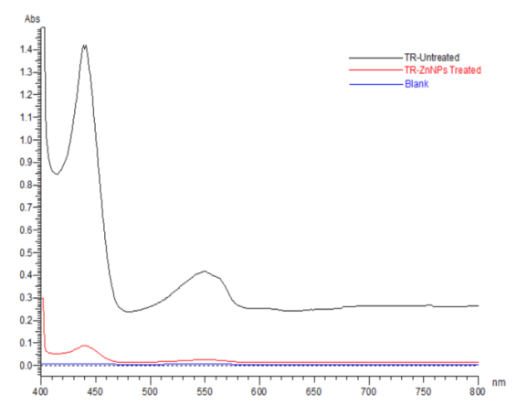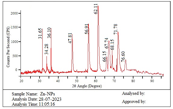 The synthesized zinc nanoparticles underwent a comprehensive characterization using a suite of analytical techniques, including TEM, EDX, SEM, FTIR, and UV-visible spectroscopy. The initial formation of nanoparticles was noted through a noticeable colour change during the initial reaction. This change in colour was further confirmed using UV-Visible Spectral Analysis, which was carried out using the Double Bean UV-Visible Spectrophotometer from JASCO (Japan) and scanning across the 800–300 nm range. FTIR analysis was conducted on a Bruker (USA) instrument, covering the spectral range of 500-4000 cm-1. This analysis aimed to identify the phytochemical groups responsible for nanoparticle formation. TEM analysis was conducted using the Jeol JEM 2100 instrument from Japan, operating at 120 keV. Before analysis, the nanoparticles underwent a thorough methanol wash and were then mounted on copper grids coated with carbon. For SEM analysis and elemental composition evaluation, the Jeol 6390LA SEM instrument, coupled with OXFORD XMX-N EDX, was employed. The instrument, utilizing a Tungsten lamp, operated at an accelerating voltage ranging from 0.5 to 30 kV. The nanoparticles were affixed to carbon adhesive tapes and supported on metal disks, with images and elemental composition data recorded at various magnifications. XRD analysis was carried out using the Bruker D8 Advance EDX instrument, operating with an energy resolution of<380 eV at 8 KeV and employing Cu Kα radiation as the source. To prevent sodium chloride crystallization, the nanoparticles underwent multiple ethanol washes prior to analysis. Scanning was performed over a 2θ range of 20-100 degrees.