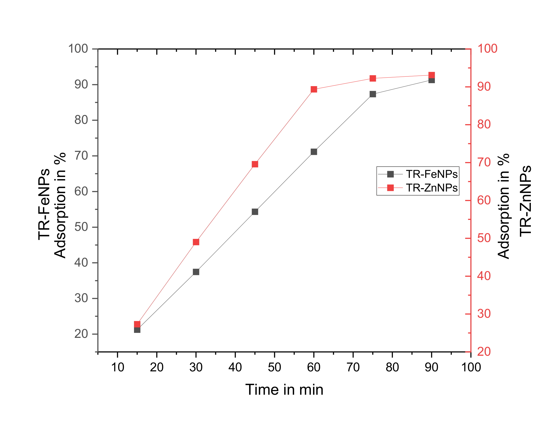 The contact time versus adsorption of sunset yellow and tartrazine using synthesised iron and zinc nanoparticles was presented in fig. 6. The sunset yellow adsorption was noticed at a % of 67.91 and 84.56 using synthesized iron and zinc nanoparticles as adsorbent respectively with in short period of 45 min. Whereas at this time, the tartrazine adsorption was noticed to be 54.32 % and 69.58 respectively, using iron and zinc nanoparticles as adsorbent. This evidence that the process of dye adsorption initiated with the rapid adsorption of dye onto the surface of nanoparticles. This initial phase of adsorption gradually decelerates once most of the available active sites become saturated. The adsorption of sunset yellow at 75 min contact time was noticed to be 89.74 % and 91.25 %, whereas tartrazine adsorption was noticed to be 87.34 % and 92.25 %, respectively, using iron and zinc nanoparticles. This study suggests that the nanoparticles possess high adsorption efficiency towards carcinogenic dyes in the study.