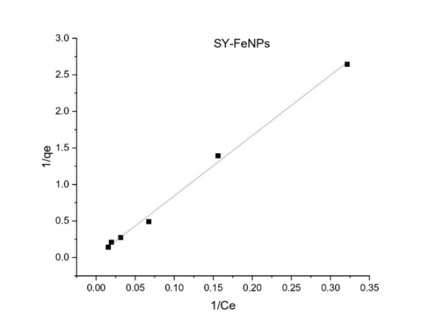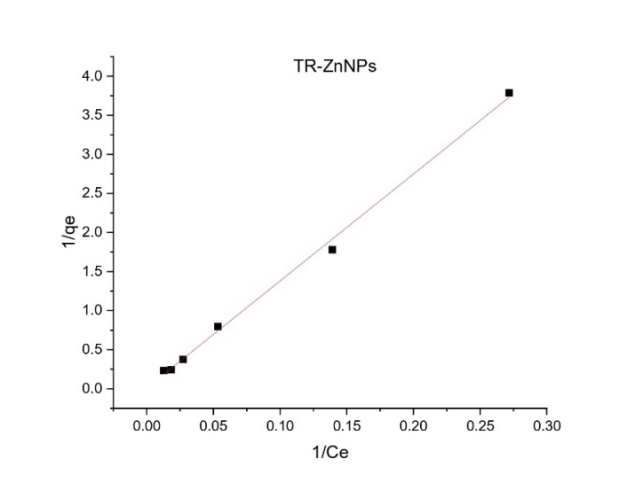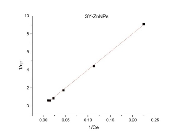 We subjected the adsorption data of sunset yellow and tartrazine to fitting with two distinct isotherm models such as Langmuir and Freundlich. This was done to establish a correlation between our experimental findings and these models. The model that provided the best fit to the data exhibited an exceptional correlation coefficient (R²) equal to unity. The Langmuir isotherm model posits that adsorption entails a monolayer formation process, wherein each active site accommodates one dye ion, and all these sites are energetically equivalent, with no interaction among adsorbed ions. Our results demonstrated that the experimental data for the adsorption of dye on synthesized iron and zinc nanoparticles exhibited a strong fit with the Langmuir isotherm model.