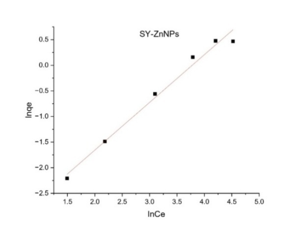 The correlation coefficient noticed in Langmuir isothermal graph was noticed to be very close to 1 suggesting that the monolayer adsorption was favorable in the study. The qmax (mg/g) was noticed to be very high for the studied dyes suggest that the process shows maximum adsorption efficiency. According to this isotherm, the concentration of ions adhering to the sorbent surface escalates as the adsorbent concentration rises, potentially allowing for the formation of multiple layers. When the adsorption intensity (n) surpasses one, it signifies the ease of isolating ions from the solution and, consequently, the feasibility of the adsorption process. The isothermal parameters calculated for adsorption study of sunset yellow and tartrazine using synthesized iron and zinc nanoparticles was tabulated in table 1. The Langmuir and Freundlich isothermal graphs for observed in the study were presented in fig. 7 and 8, respectively.