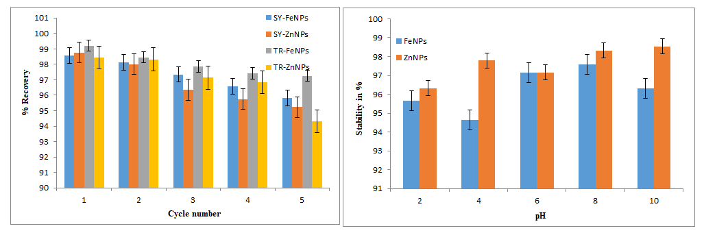 Fig. 10: Comparative stability and recyclability results of nanoparticles in the study, A) Stability of nanoparticles at various pH ranges; recyclability of nanoparticles B) Results presented in graph are the average of three replicate experiments
