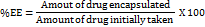 Encapsulation efficiency (EE) was determined by measuring the unencapsulated cholecalciferol by centrifugation. Several BSA-NP cholecalciferol was dispersed in methanol and centrifuged at 1000 rpm at 4 ᵒC for 15 min. Cholecalciferol, which was not encapsulated in the supernatant, was measured using a spectrophotometer at a wavelength of 264.6 nm [18]. %EE is calculated using the following formula: