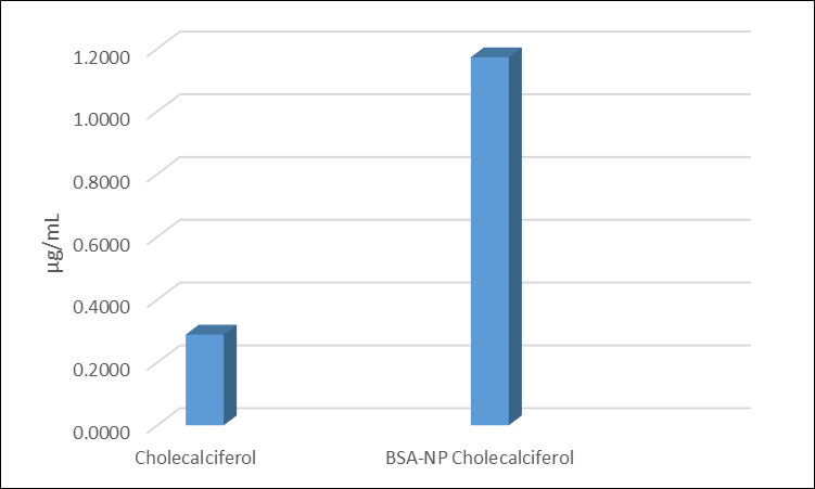 Based on the data in fig. 2, the solubility of pure cholecalciferol in water is 0.29±0.012 µg/ml, while the solubility of BSA-NPs cholecalciferol in water is 1.17±0.012 µg/ml. These results indicate that the solubility of BSA-NPs cholecalciferol is four times higher when compared to its pure form of cholecalciferol.