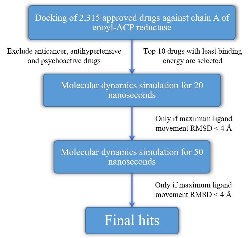 Methods: In this in silico study, a library of FDA-approved drugs was screened by molecular docking against the monomer of enoyl-acyl carrier protein reductase to recognize potential inhibitors. Then, those best drugs with minimum docking energy were subjected to molecular dynamics simulation.
