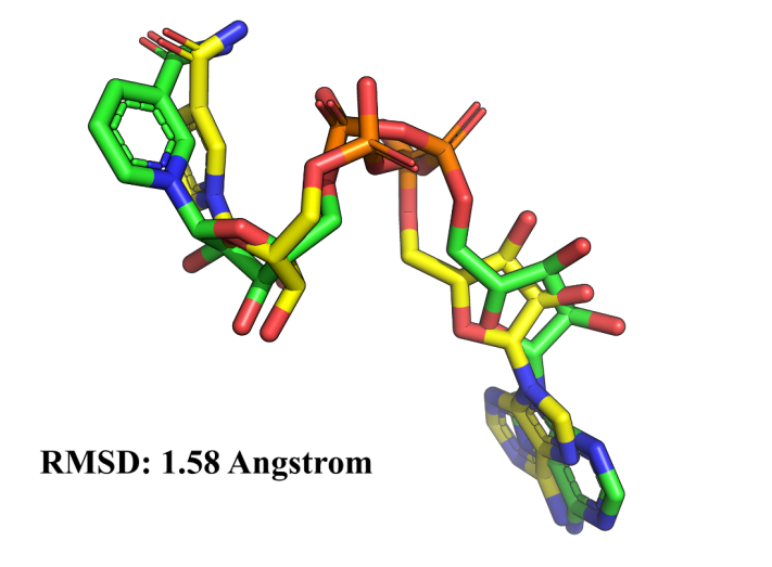 Fig. 2: An alignment of NAD+ native conformation (green color) with the docked conformation (yellow color)