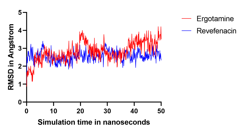 Fig. 3: A plot of ligand movement RMSD versus molecular dynamics simulation interval for both ergotamine and reverencing
