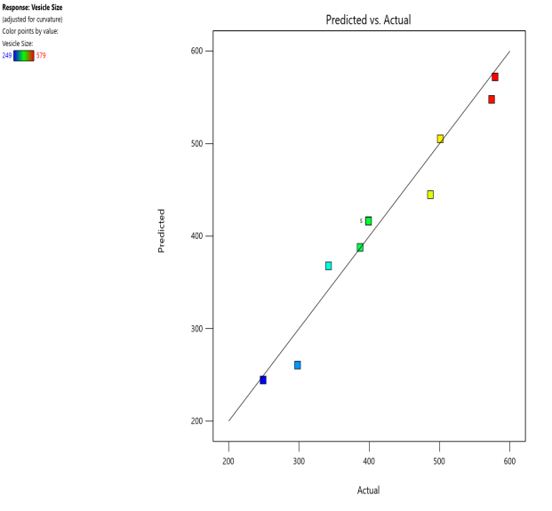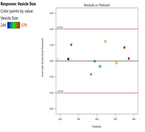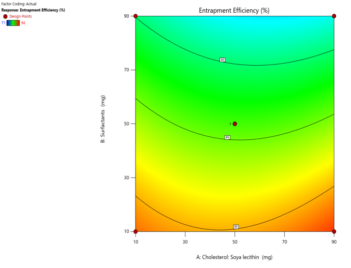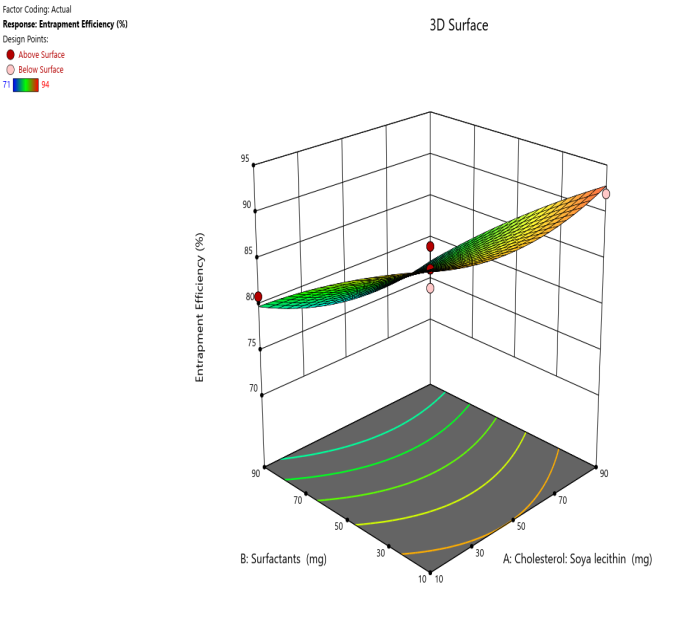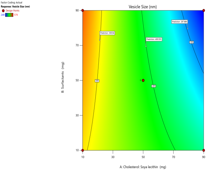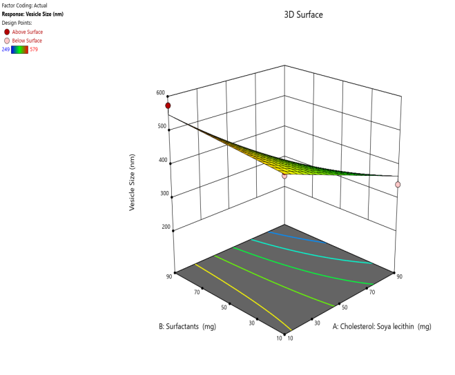 In the current investigation, Design expert software Version 12 was employed to enhance two key transferosomal parameters, specifically vesicle size and percentage entrapment efficiency. Component A is cholesterol (soy lecithin), and component B is the edge activator were chosen as the independent variables. The size of the vesicle and percentage entrapment efficiency was chosen as dependent variables. Components A and B were given values of 10 mg for the lower value and 90 mg for the higher value. Response surface plots were created utilizing the CCD based on the mentioned independent and dependent variables. Based on preliminary experiment results and the feasibility of creating transfersomes at extreme values, the experimental ranges for each element were selected. All variable values and batch codes are listed in table 1. To choose which optimum formulation to utilize, the software's solution was used [20-22].