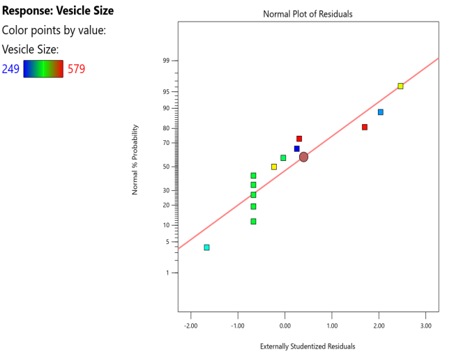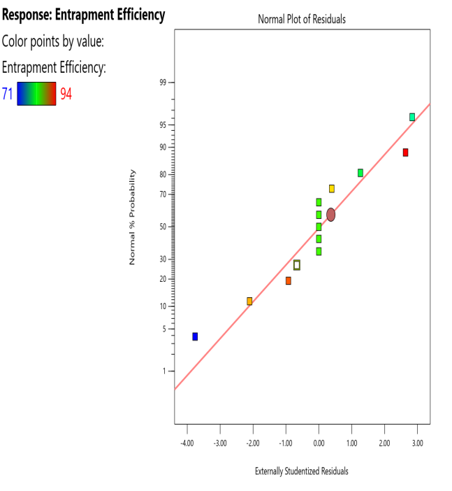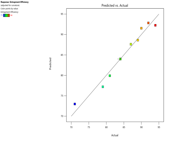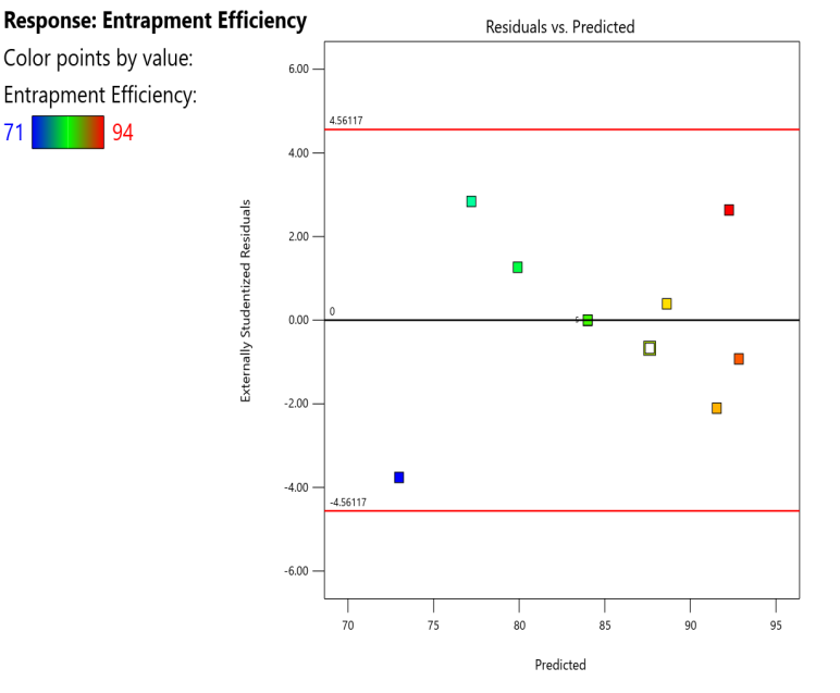 Design-Expert Software Version 12 suggested a CCD for the current study that took into account the concentration of the surfactant and the amount of soy lecithin in a total of 13 experimental formulations of transferosomal gels containing naproxen. As a result, it was investigated how these factors affected the % entrapment efficiency and vesicle size of prepared transferosomal gels containing naproxen. Table 1 provides a summary of the matrix of the design, which also includes the experimental strategy and observed response values. To obtain model equations involving distinct primary components and interaction factors for each response under study, the values of observed responses measured for all trial formulations were fitted in the central composite design. One-way ANOVA was used to statistically test these models (p<0.05). The models seemed to be significant (p<0.05) when the model p values for both measured responses were less than 0.05.