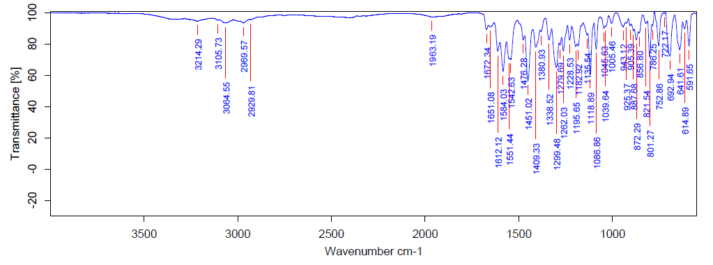 For infrared analysis of samples utilizing the KBr pellet technique, the FTIR spectrum of drug sample and drug combined with excipients was used. Dry potassium bromide was combined with around 1-3 mg of the sample, and the mixture was then used to analyze the samples in transmission mode over a 4000-400 cm-1 wave number range [23, 24]. The peaks correspond to those in fig. 5 depict the distinctive drug absorption for various functional groups.