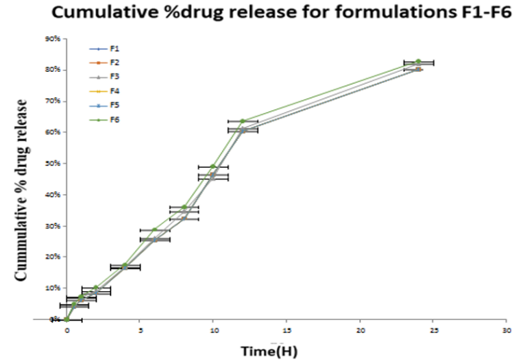 Fig. 6: %Cumulative drug release for formulations F1-F6, (All determinations were performed in triplicate and values were expressed as mean±SD., n=3)